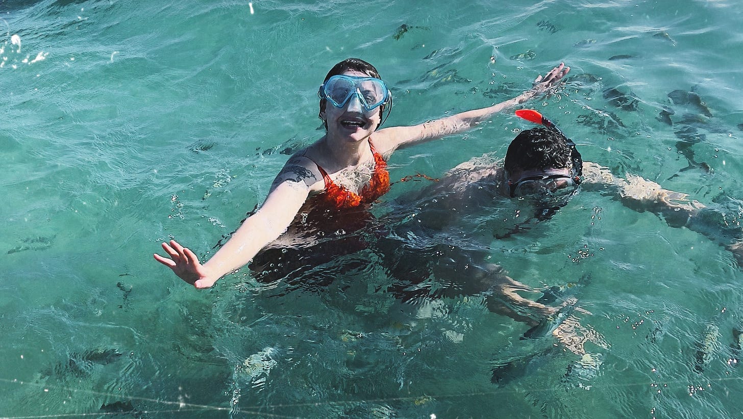 Chegando nos peixinhos, passamos um tempo aproveitando a água bastante quente e rasa. Como não sei nadar, a profundidade do mar era determinante para eu entrar na água.