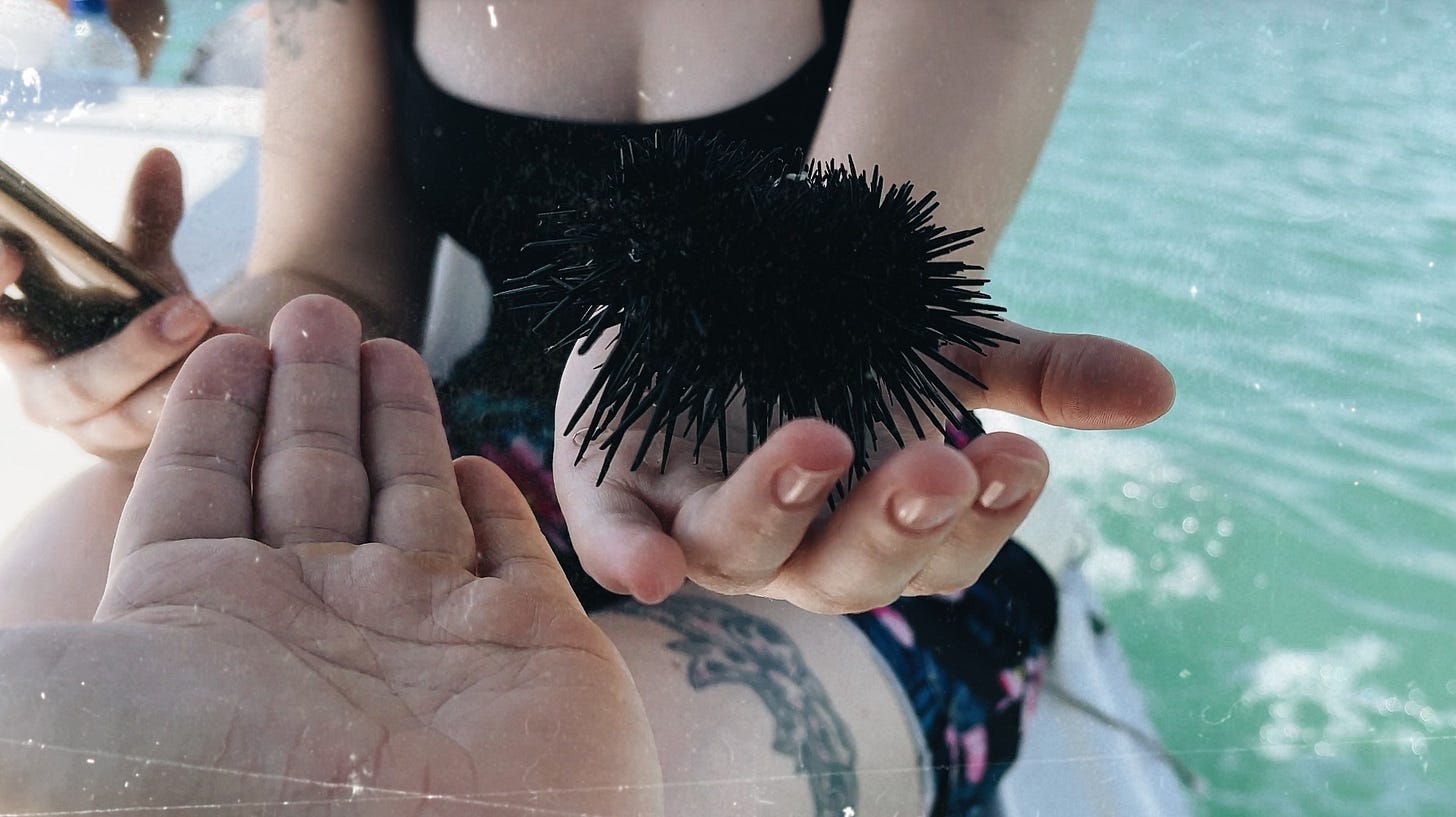Numa dessas, Praia de São Miguel, fizemos passeio de barco até um recife. Pela primeira vez na vida peguei um ouriço nas mãos. É incrível como uma pedra cheia de espinhos contém vida. O piloto do barco — Posso chamar de marinheiro quem pilota um barco a motor? — bem, o marinheiro pegou um para que pudéssemos observar.
