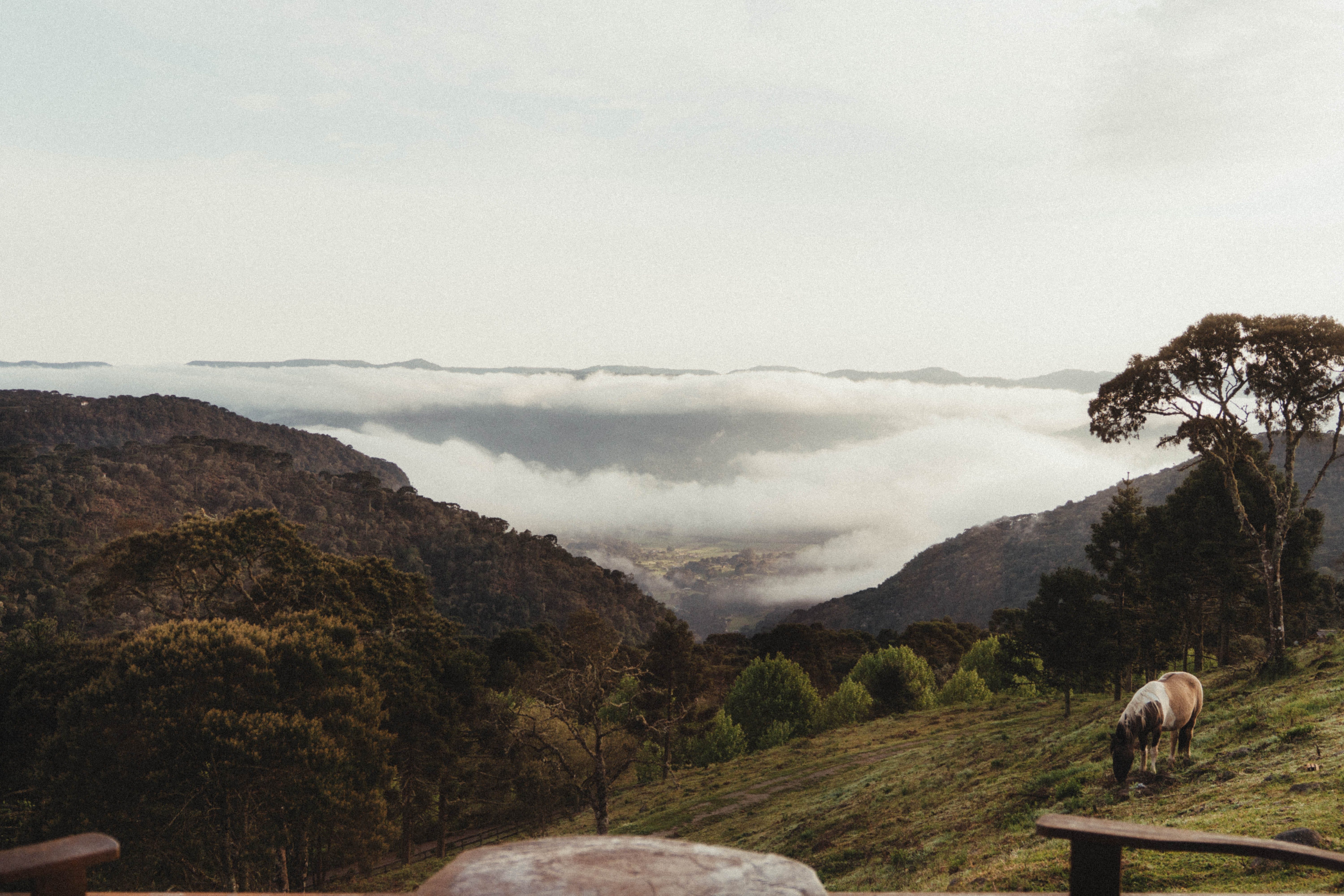 Me despedi da cabana e dos cachorros que me adotaram nos últimos dois dias. Quando acordei, por causa do cachorro que latia para os cavalos da propriedade, vi que as nuvens cobriam o vale.
